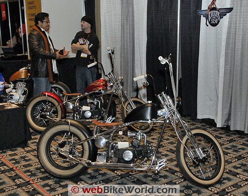 The Kikker 5150 “Hardknock Frisco Bobber” (first photo) has an old-style springer front suspension, forward controls, a jockey shift, electric start, solo seat, hydraulic disk brake, chrome plated TIG welded 4130 chrome-moly frame, and your choice of a 49cc or 110cc four-stroke engine with a four speed tranny.