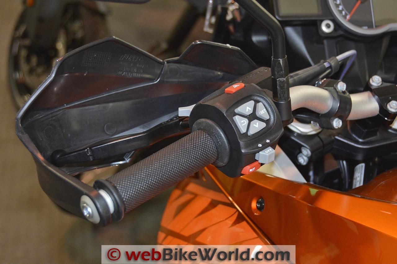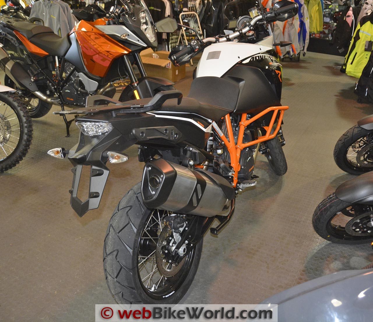 The silver/black standard Adventure shown in the photos has a full array of KTM accessories, including the bags, tank bag, heated seat, crash bars (standard on the R) and Akrapovič exhaust.