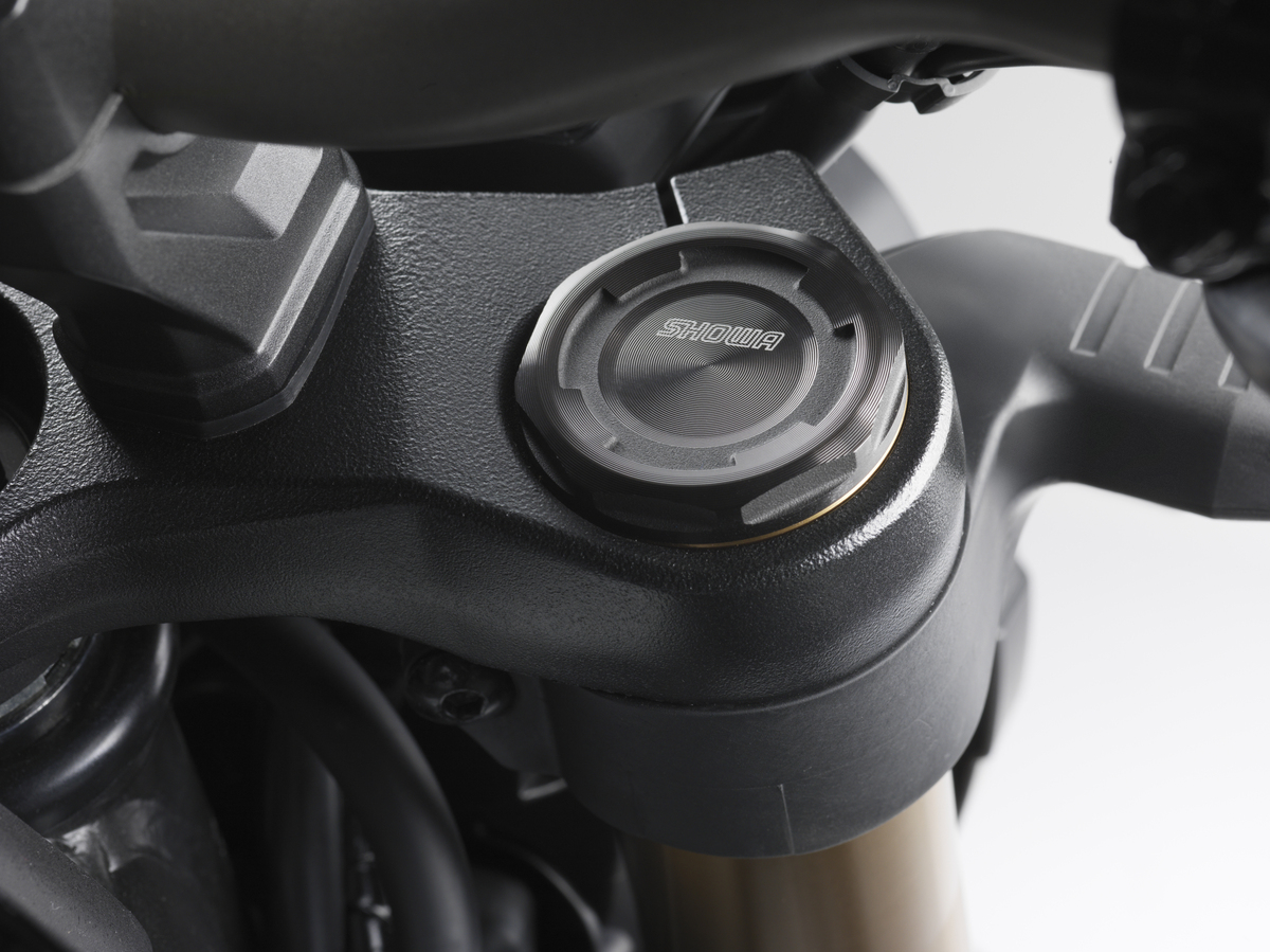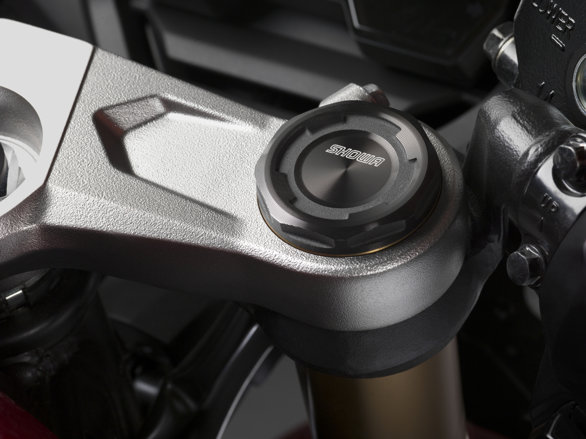 The front suspension showcases some leading-edge technology. The 41mm fork is equipped with Showa’s Separate Function Fork (SFF) which offers reduced weight, superior rigidity, and excellent overall performance. The aluminum lower triple clamp completes the picture.