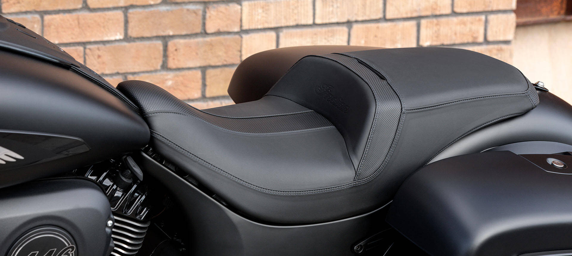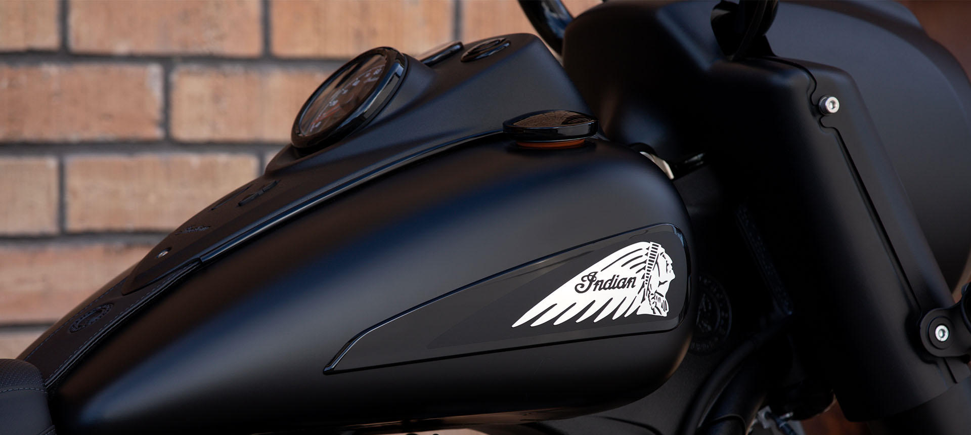 Inspired by the look of custom bikes, an open front fender exposes the 19″ 10-spoke contrast-cut front wheel, with the iconic Indian Motorcycle headdress leading the way.