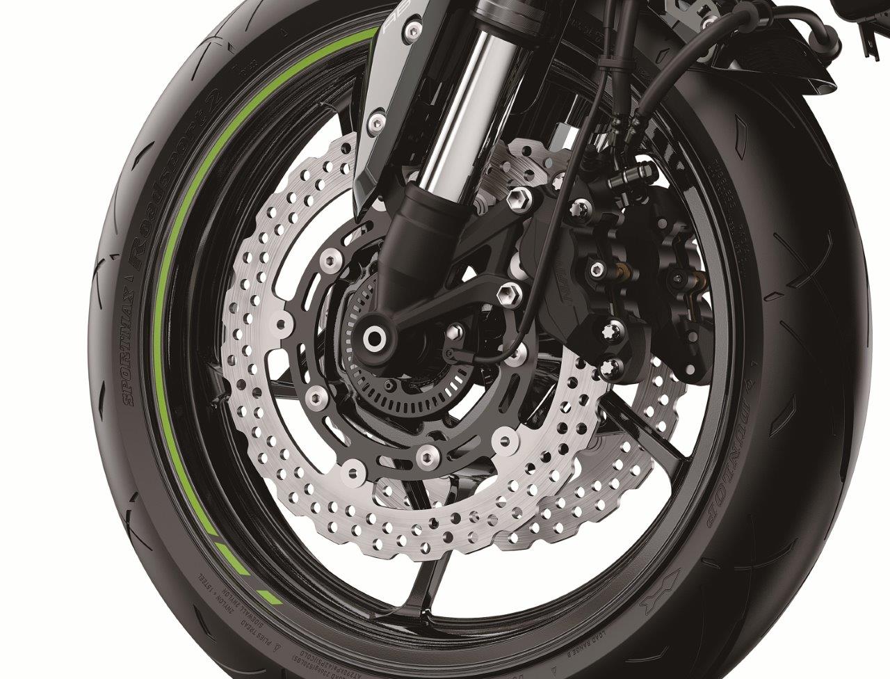Kawasaki ABS systems use front and rear wheel sensors to constantly monitor wheel speed. Should information from either of the sensors indicate that wheel lock has occurred, the ABS ECU directs the pump in the ABS unit to modulate brake fluid pressure (releasing and reapplying pressure so that traction can be regained) until normal operation resumes. ABS offers rider reassurance that contributes to greater riding enjoyment.