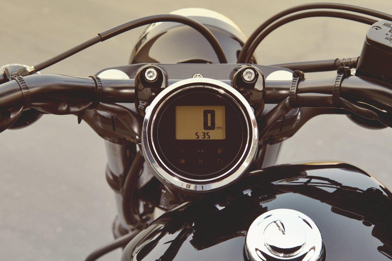 The 3.4-gallon fuel tank is a traditional teardrop style, with a slim shape that includes flattened top and side surfaces to enhance Bolt styling. The tank features a flangeless design for even cleaner lines.