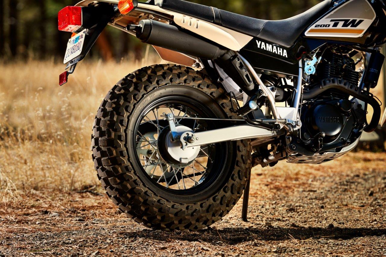 Fat 130/80-18 front and 180/80-14 rear tires provide excellent traction, control, and the TW200’s unique dual-purpose style.