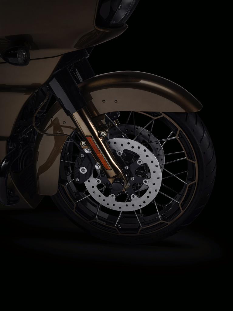 The CVO Road Glide has exclusive features such as Stage II Harley-Davidson® Audio powered by Rockford Fosgate, Dual Daymaker® LED Headlamps, RDRS Safety Enhancements, and Wireless headsets are but a few. Exclusive paint finishes and 21-inch front and 18-inch rear wheel finished in gloss black and contrast smoked satin, this set adds the ultimate one-of-a-kind style.