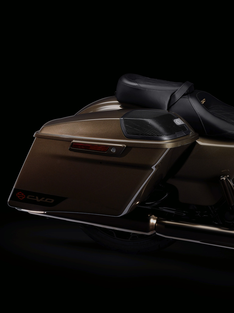 The Milwaukee-Eight® 117 V-Twin engine is exclusive to CVO models and is currently the most-powerful engine offered in the 2021 Harley Davidson lineup, putting down 125 ft. lbs. of torque, thanks to a high-performance camshaft and intake. Full-on custom treatment from fender to fender. You get custom seat covers and stitching, a heavy breather air cleaner, heated Kahuna™ collection hand grips and Kahuna™ controls, a fang front spoiler—the list goes on.