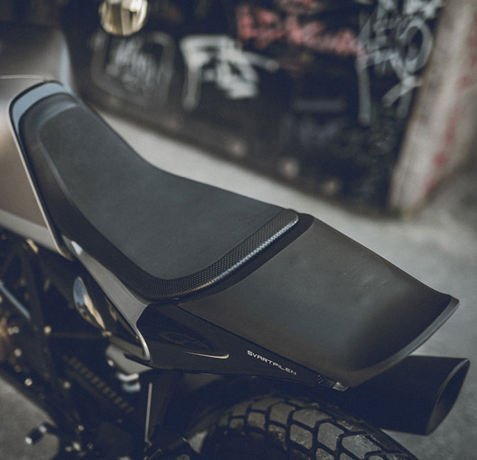 The seat of the Svartpilen 401 uses high-quality foam and leather fabric, which, despite its reduced appearance, remains comfortable for the rider. Extending from the main bodywork and seamlessly floating above the rear wheel, the seat adds to the timeless design and unique riding experience the Svartpilen 401 provides.
