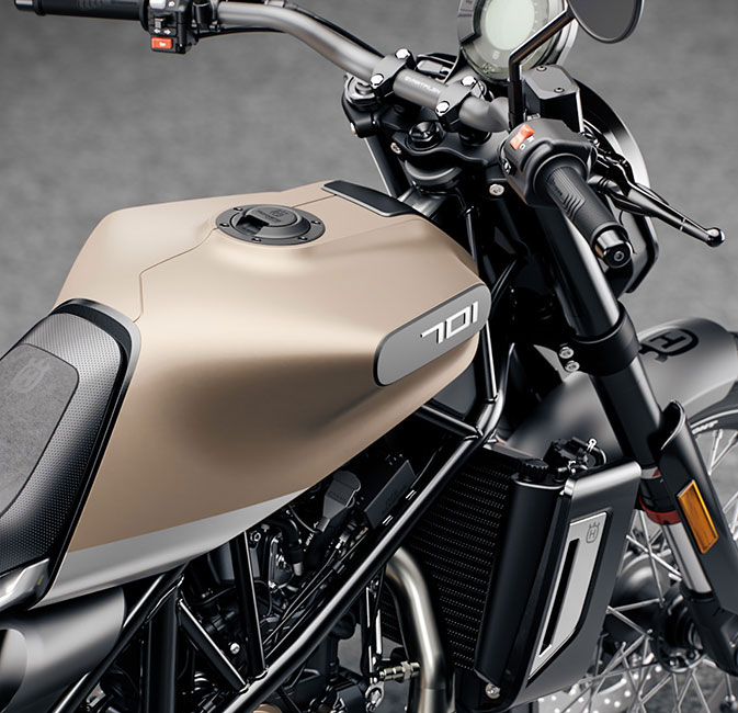 Offroad style handlebars and risers attach to stylishly forged aluminium triple clamps, central to the control zone of the Svartpilen 401. In keeping with the minimalistic look of the authentic design, the control zone is not obstructed by any fairings and simply features a digital display unit with the necessary information.