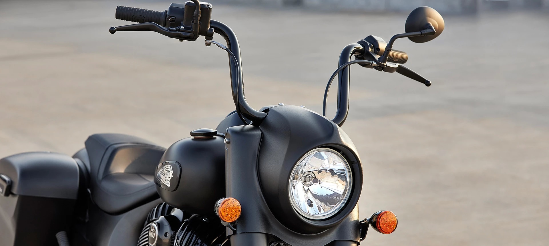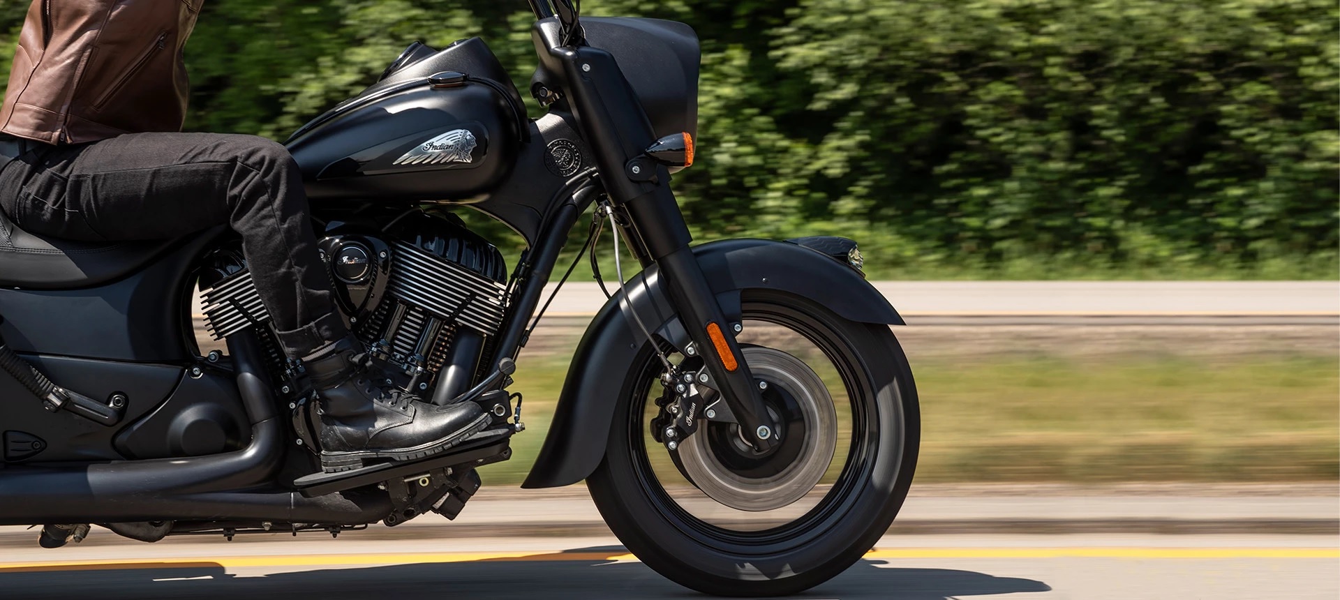 Inspired by the look of custom bikes, an open front fender exposes the 19 in 10-spoke contrast-cut front wheel, with the iconic Indian Motorcycle headdress leading the way.