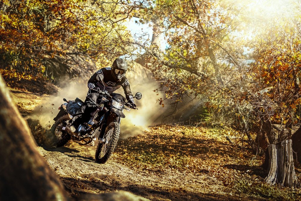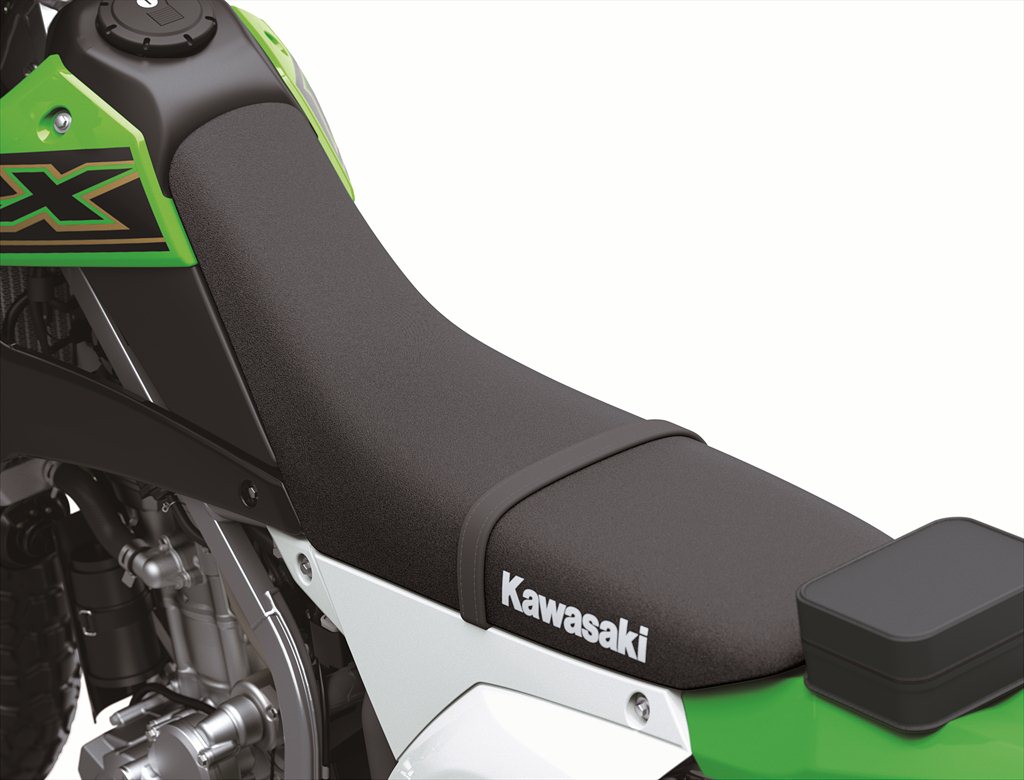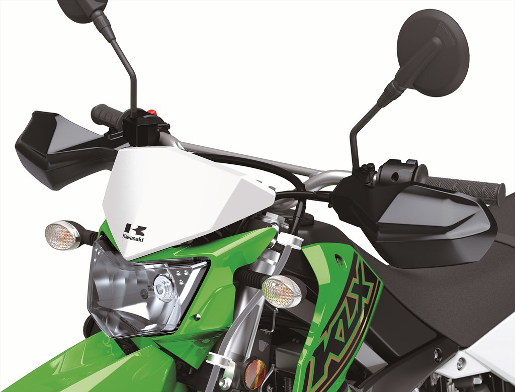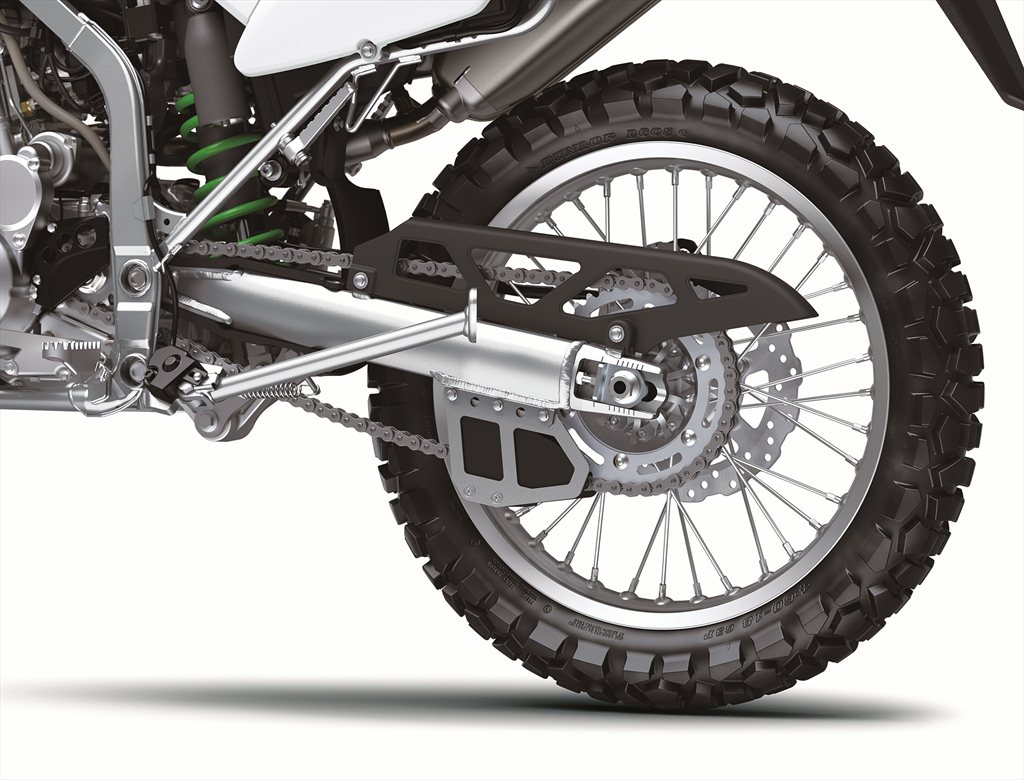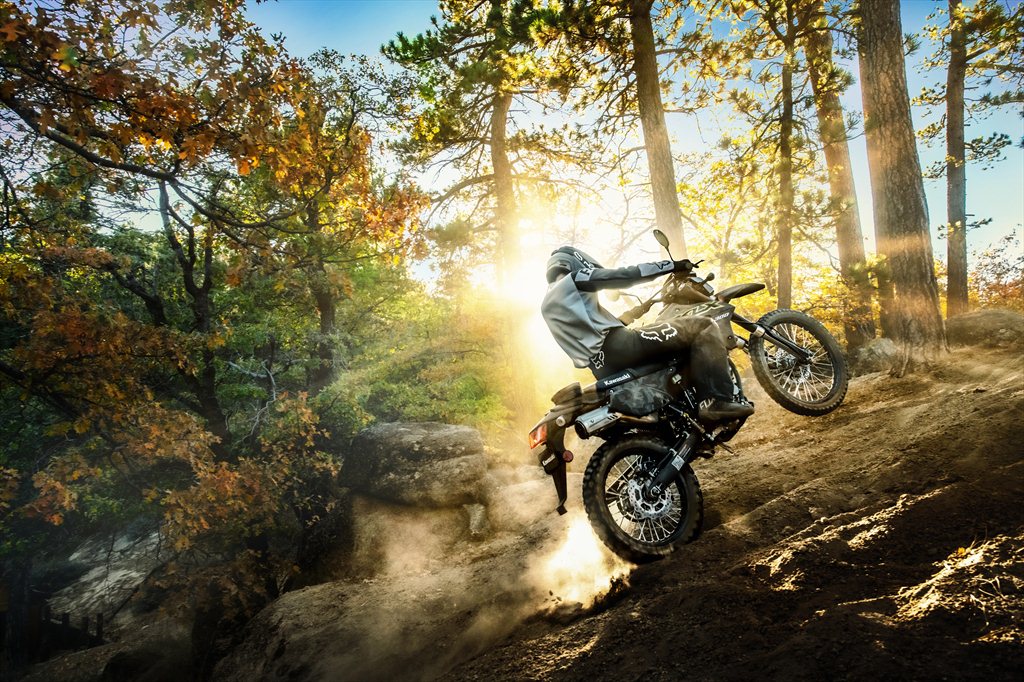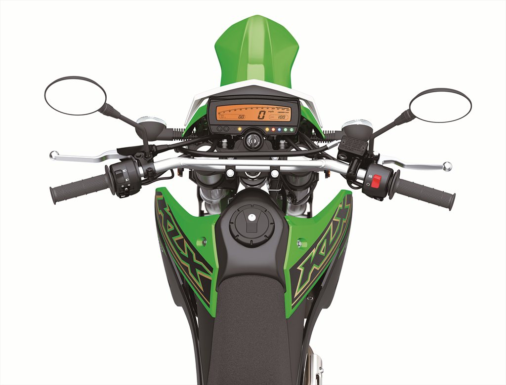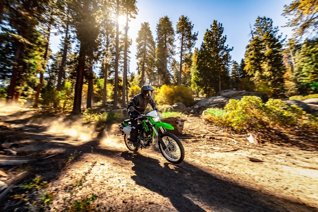 Kawasaki then takes off the fully off-road tires and gives it more friendly tires that still have off-road grip, but are sticky enough for on-road use. Indicators, a license plate holder, headlight, fully digital instrumentation and a muffler that cuts down on the noise are then added, A slightly stiffer front shock and a fully adjustable rear shock complete the trail-bike-to-dual-sport modifications.