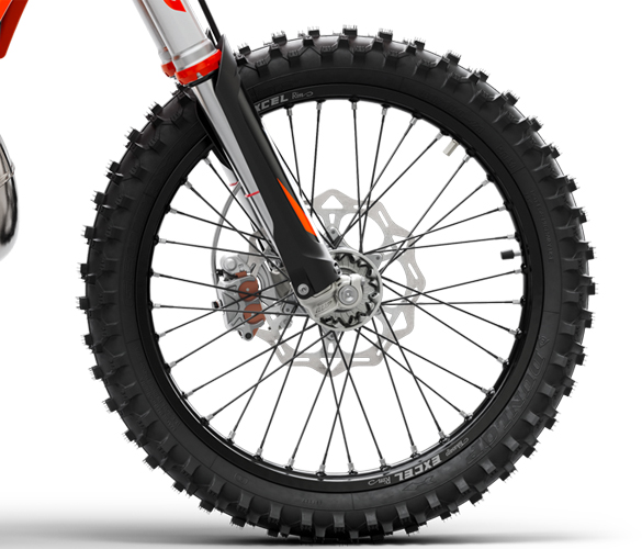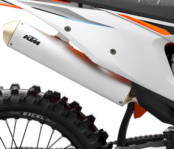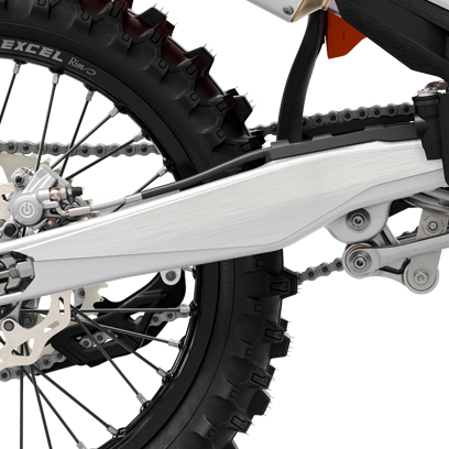 The frame is professionally crafted from hydroformed chromium molybdenum steel tubes that are robot welded, ensuring the highest levels of consistent quality. The stiffness has been precisely tailored for the most dynamic handling, and works in perfect harmony with the suspension to provide nimble agility without losing high-speed stability. The frame also features “no dirt” footpegs, which have a simple but effective self-cleaning system that ensures the footpegs return to their original position, providing complete control in all conditions. All SX frames feature the same highly durable powder coating as the KTM Factory machines and come with standard frame protectors. The subframe is made from lightweight aluminum, providing rear fender stability and strong support for the rider at little extra weight.