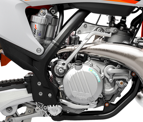 The engine of the KTM 250 SX features the latest 2-stroke technology, with a counter-balance shaft for low engine vibration, as well as a reliable hydraulically operated DDS clutch. It has a twin-valve controlled power valve, which contributes massively to making the KTM 250 SX engine the most competitive 2-stroke in its class. Powering through its 5-speed transmission truly is an exhilarating experience.