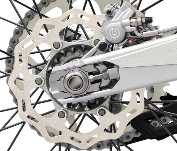 The one-piece swingarm is manufactured using a gravity die-cast production process for exceptional strength at the lowest possible weight. It offers a wide range of adjustment for the rear wheel, allowing for a shorter wheelbase on tighter, twisty tracks, or a longer wheelbase for greater stability on longer, more choppy tracks. The swingarm’s chain measurement markings are visible from above, making adjustment simpler and more accurate.