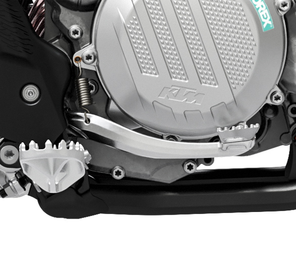 The engine has a strong 5-speed gearbox built to suit any kind of motocross track. The gear ratios were developed specifically to match the power delivery of the 250 cc engine. The gearbox also features a “no-dirt” gear shifter. Similar to the foot peg design, it prevents the build-up of dirt and ensures the next gear is always available, no matter what the conditions.
