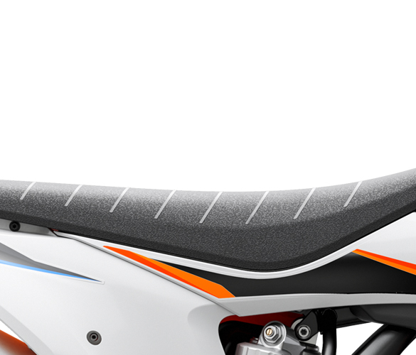 All KTM SX models feature a seat that perfectly matches the range’s dynamic performance-oriented ergonomics. The seat cover features silicone strips that provide better feel and grip for the rider. The seat is conveniently fixed to the bike using one long, lateral screw, making it secure and easy to handle.