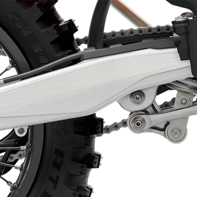 The high-tech, lightweight chrome-moly steel frame has a knack for easy handling, outlandish rideability, precise cornering and excellent stability. You can also count on precisely calculated stiffness of the frame. This results in better absorption of the energy created from the front and rear suspension, sucking up jumps and bumps. In short: more comfort and less rider fatigue. Laterally attached, lightweight aluminum engine head stays (the connection between cylinder head and frame) contribute to more precise cornering and a reduced vibration level. The engineers were able to pull off all that, while making their frame 2.2 pounds lighter than that of the lightest competitor on the market. In addition, it is easier to maintain, easier to work on and supplies more space for the tank and other components. The bike also features an extra-light subframe made of aluminum, which tips the scales at less than 2 pounds.