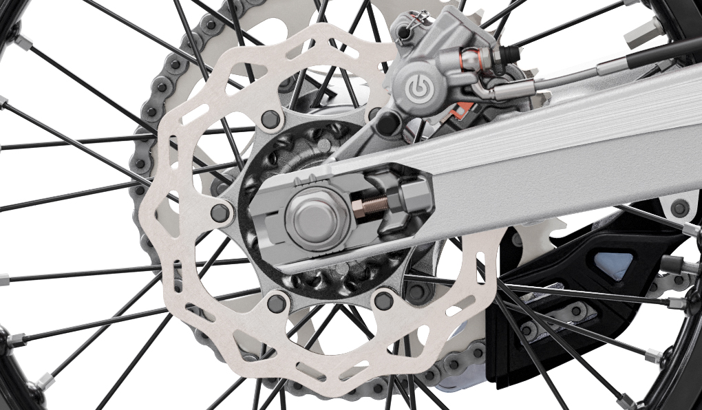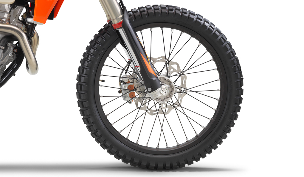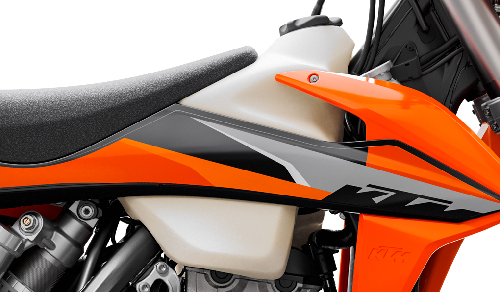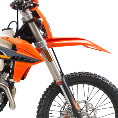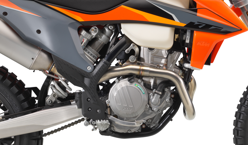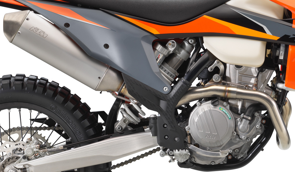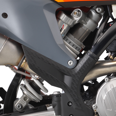 All EXC models feature high-tech, lightweight chromoly steel frames. This includes hydro-formed elements produced by state-of-the-art robot welding. With its race-proven geometries and optimal stiffness, the frame provides great feedback for the rider, playful handling and remarkable stability. The laterally attached engine head stays (the connection between cylinder, head and frame) are made of aluminum, reducing vibration and further contributing to precise cornering. The bikes also feature lateral frame guards with a structured surface, improving grip, while also serving as a heat protector against the muffler on the right side. The subframe is made of extra-light and stable aluminum profiles, weighing less than 900 gr, providing great rear fender stability.