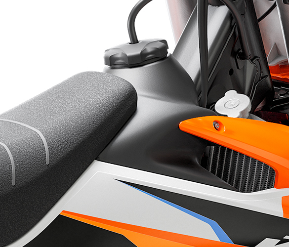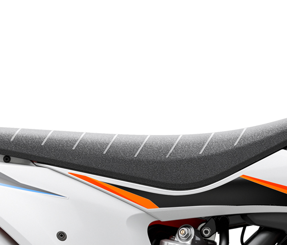 All KTM SX models feature a seat that perfectly matches the range’s dynamic performance-oriented ergonomics. The seat cover features silicone strips that provide better feel and grip for the rider. The seat is conveniently fixed to the bike using one long, lateral screw, making it secure and easy to handle.