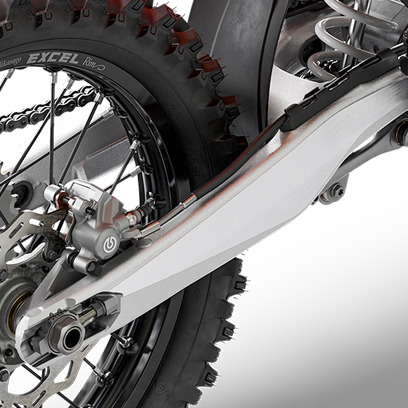 The KTM 450 SX-F’s one-piece swingarm is manufactured using a gravity die-cast production process for exceptional strength at the lowest possible weight. It offers a wide range of adjustment for the rear wheel, allowing for a shorter wheelbase on tighter, twisty tracks, or a longer wheelbase for greater stability on longer, more choppy tracks. The swingarm’s chain measurement markings are visible from above, making adjustment simpler and more accurate.