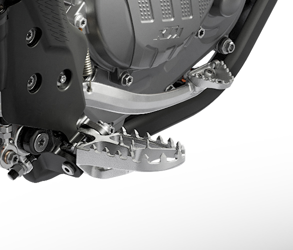 The compact engine cases are manufactured using a high pressure die-cast production process that helps with weight reduction, while retaining strength and durability. The design allows for optimal shaft arrangements close to the center of gravity, resulting in better mass centralization and easier rideability. The engine covers feature a smart surface structure that reduces wear caused by the rider’s boots, keeping them looking as fresh as the day you bought it.