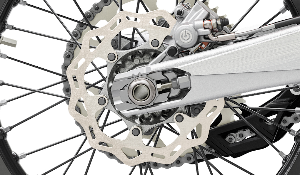 The high-tech, lightweight chrome-moly steel frame has a knack for easy handling, outlandish rideability, precise cornering and excellent stability. You can also count on precisely calculated stiffness of the frame. This results in better absorption of the energy created from the front and rear suspension, sucking up jumps and bumps. In short: more comfort and less rider fatigue. Laterally attached, lightweight aluminum engine head stays (the connection between cylinder head and frame) contribute to more precise cornering and a reduced vibration level. The engineers were able to pull off all that, while making their frame 2.2 pounds lighter than that of the lightest competitor on the market. In addition, it is easier to maintain, easier to work on and supplies more space for the tank and other components. The bike also features an extra-light subframe made of aluminum, which tips the scales at less than 2 pounds.