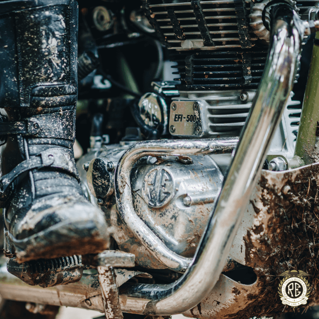 The motorcycle itself is a standard Bullet 500, with the same 499cc single-cylinder that pushes out the same 27.2 BHP and 30.5 lbs-ft of crank torque. What separates the two bikes, however, is the styling and specification of the bike’s body. The handlebars are braced and reinforced with a steel crossbar, the suspension has longer travel than the standard Bullet, and the exhaust is upswept and out of the way in a distinctly scrambler-esque design.