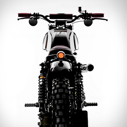 In terms of looks, it’s a downright tribute to a classic. The same lines, the same sturdy frame, the same large main headlight. A bump stop seat and clip-on handlebars bring the racing heritage of the motorcycle to the forefront, while the footpegs are raised and pushed back to give the rider stability while in a racing tuck. The fuel tank is modified over the standard Royal Enfield type to have recesses perfectly positioned to let your knees squeeze in as you lean the bike over to carve the next corner.