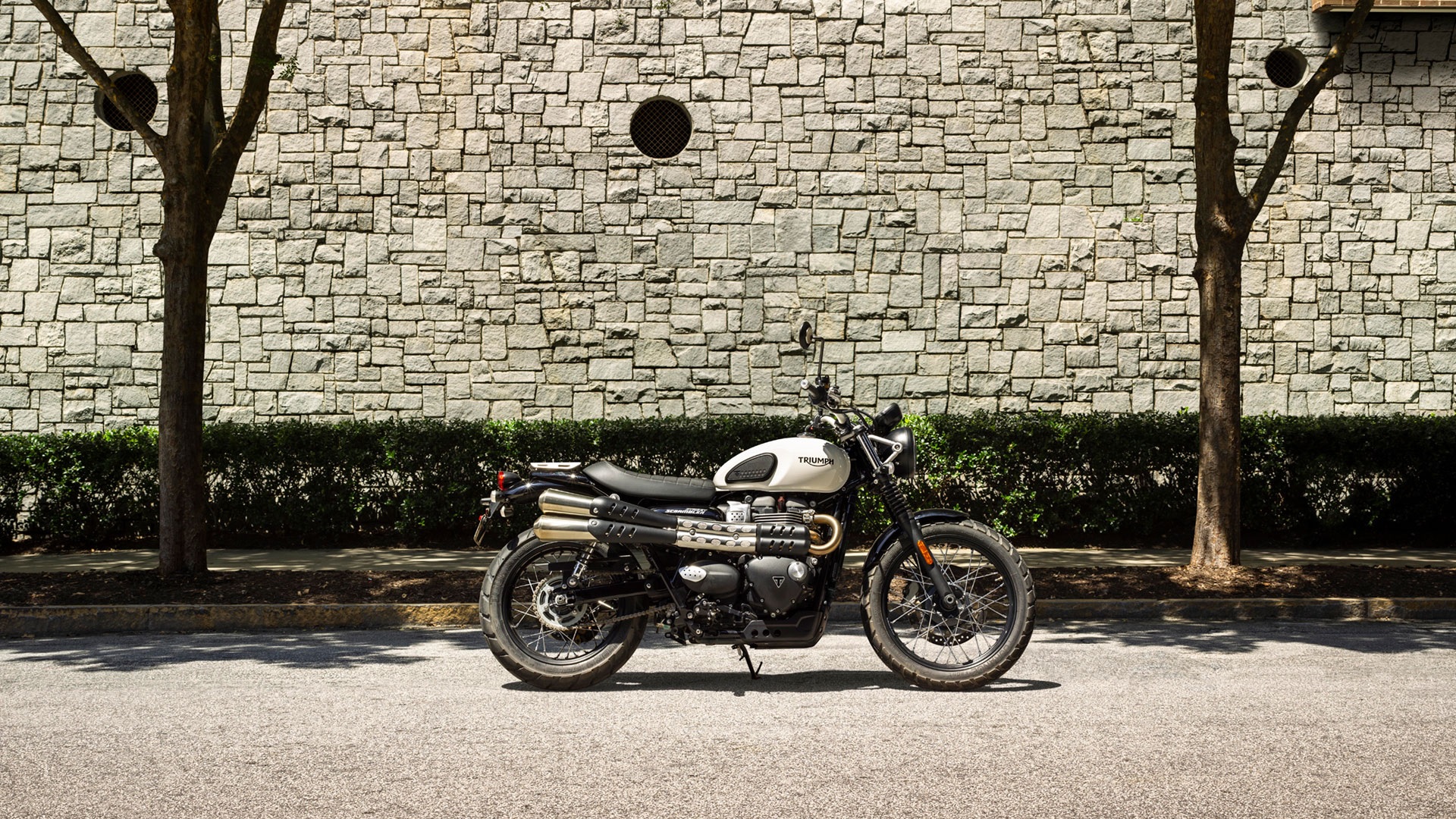 Triumph Street Scrambler parked near rocks