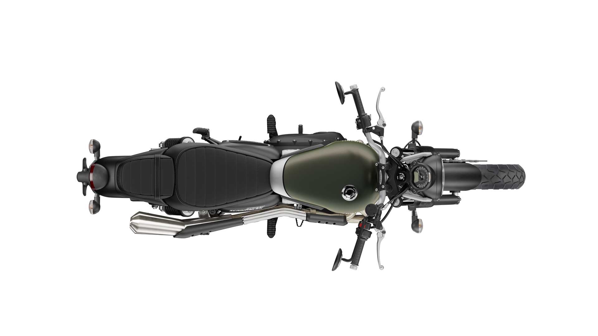 THAT UNMISTAKABLE HIGH LEVEL TWIN EXHAUST. Delivering the rich British twin scrambler soundtrack is the Street Scrambler’s elegant twin high level exhaust system. With brushed stainless steel headers, that follow a crafted tight-radius flowing line, this exquisitely engineered exhaust incorporates an intricate header run that hides the cat box out of sight between the heat shield and Triumph’s signature finned engine barrel. Finished off by brushed stainless steel silencers with cool contrasting black heat shields, this is one of the hallmarks of the original true scrambler style.