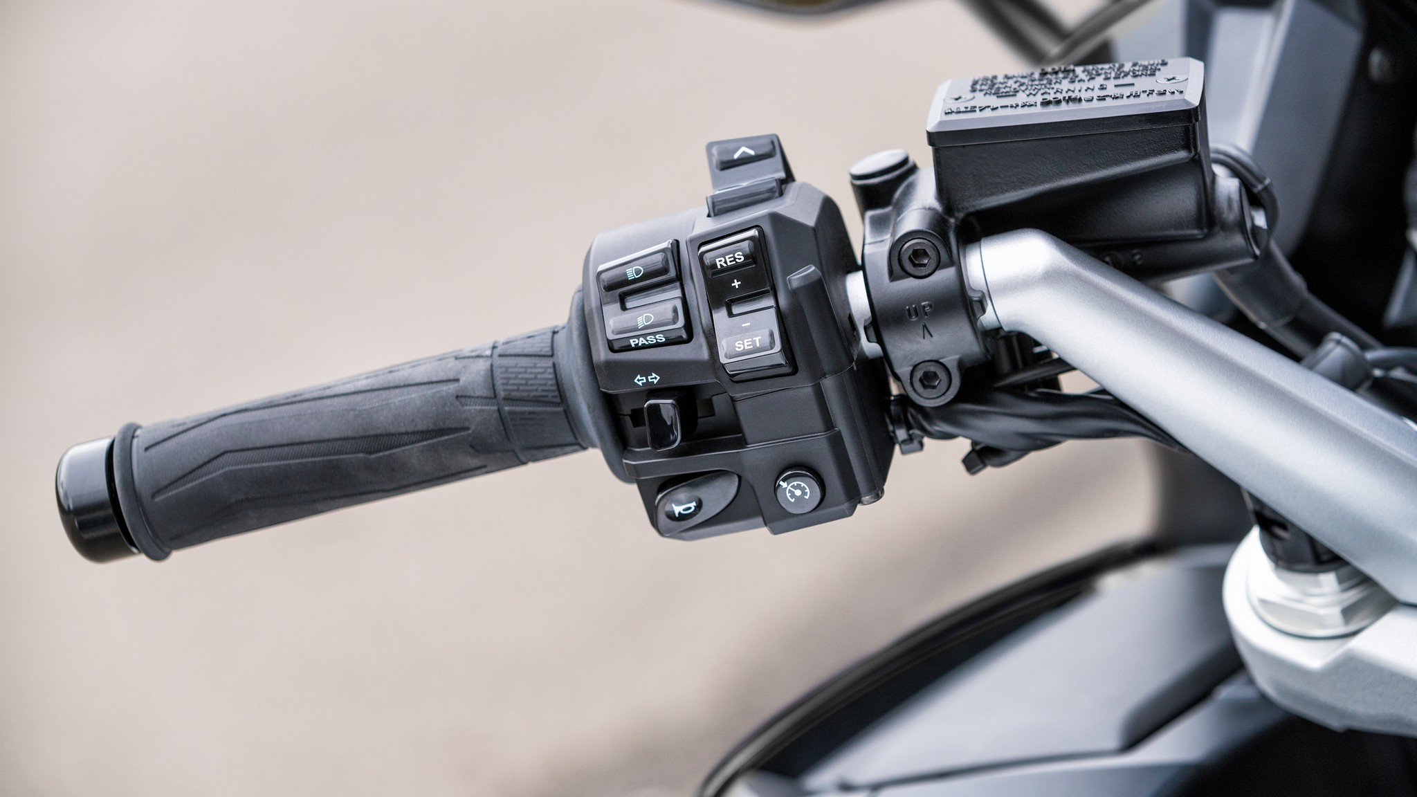 Cruise control makes touring a breeze, adjusting a set speed via a single push to the switch or, for larger adjustments, by continuously pushing the switch. A resume function returns the cruise control to the most recent setting, while activating the brakes, clutch or throttle return releases the cruise control.