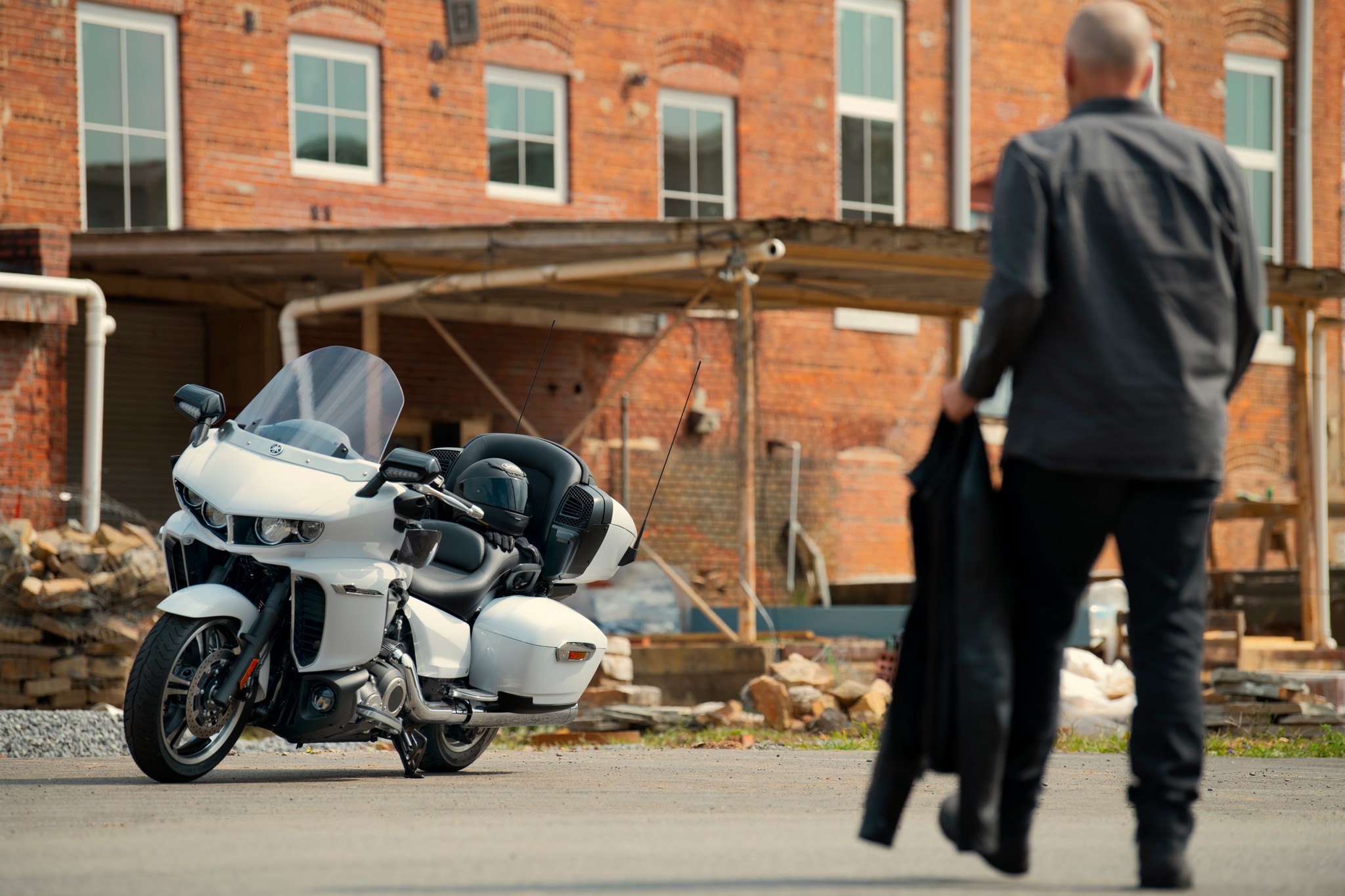 Mounted high in the cockpit for improved visibility, the 7-inch full-color LCD display puts a huge array of information and control at the rider’s fingertips. Controlled via touchscreen, handlebar controls or voice commands, this infotainment package gives the rider access to vehicle control and data, a range of audio sources, and wireless Bluetooth® communications options.