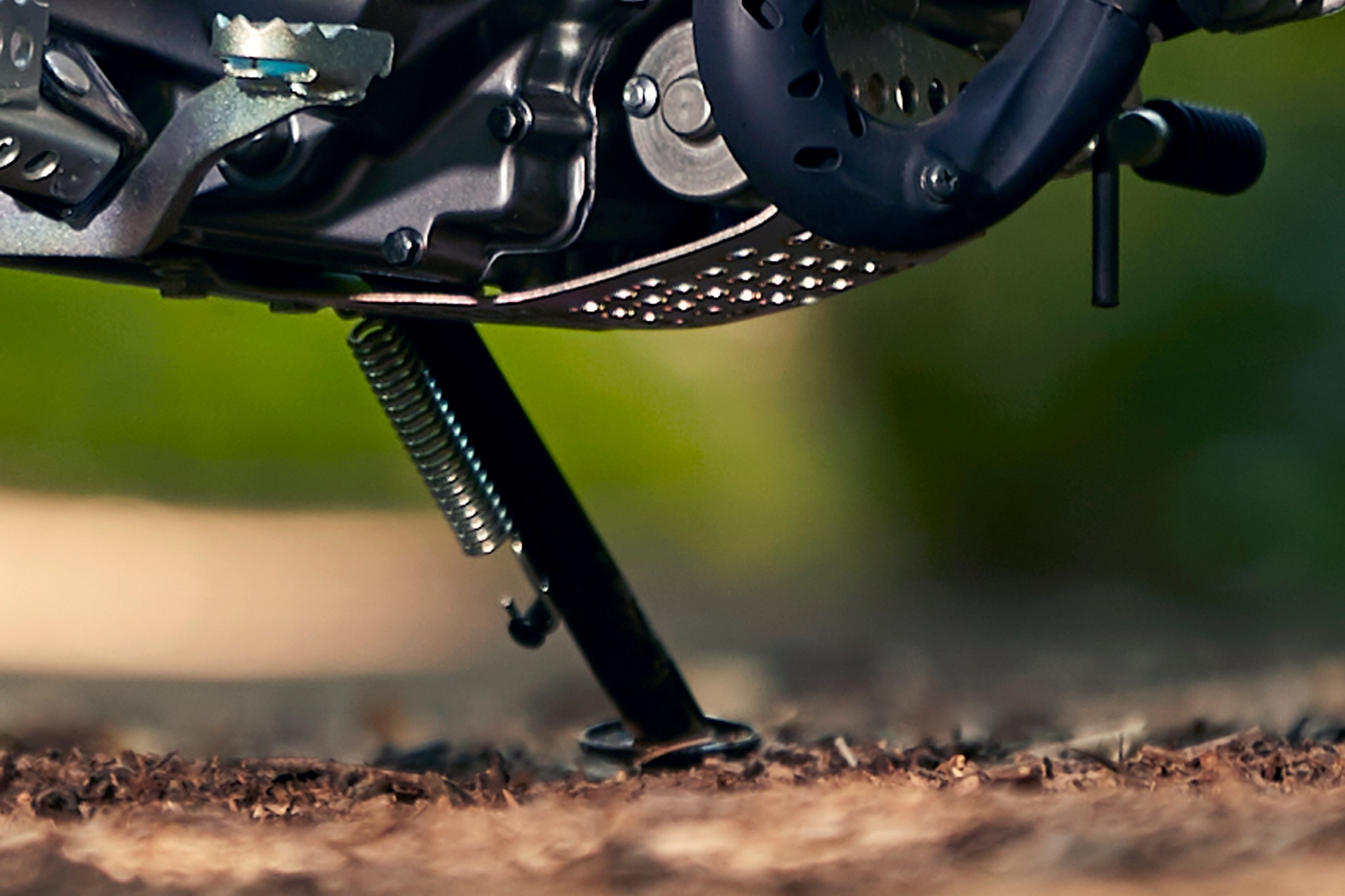 Standard side stand tucks up out of the way when not in use.