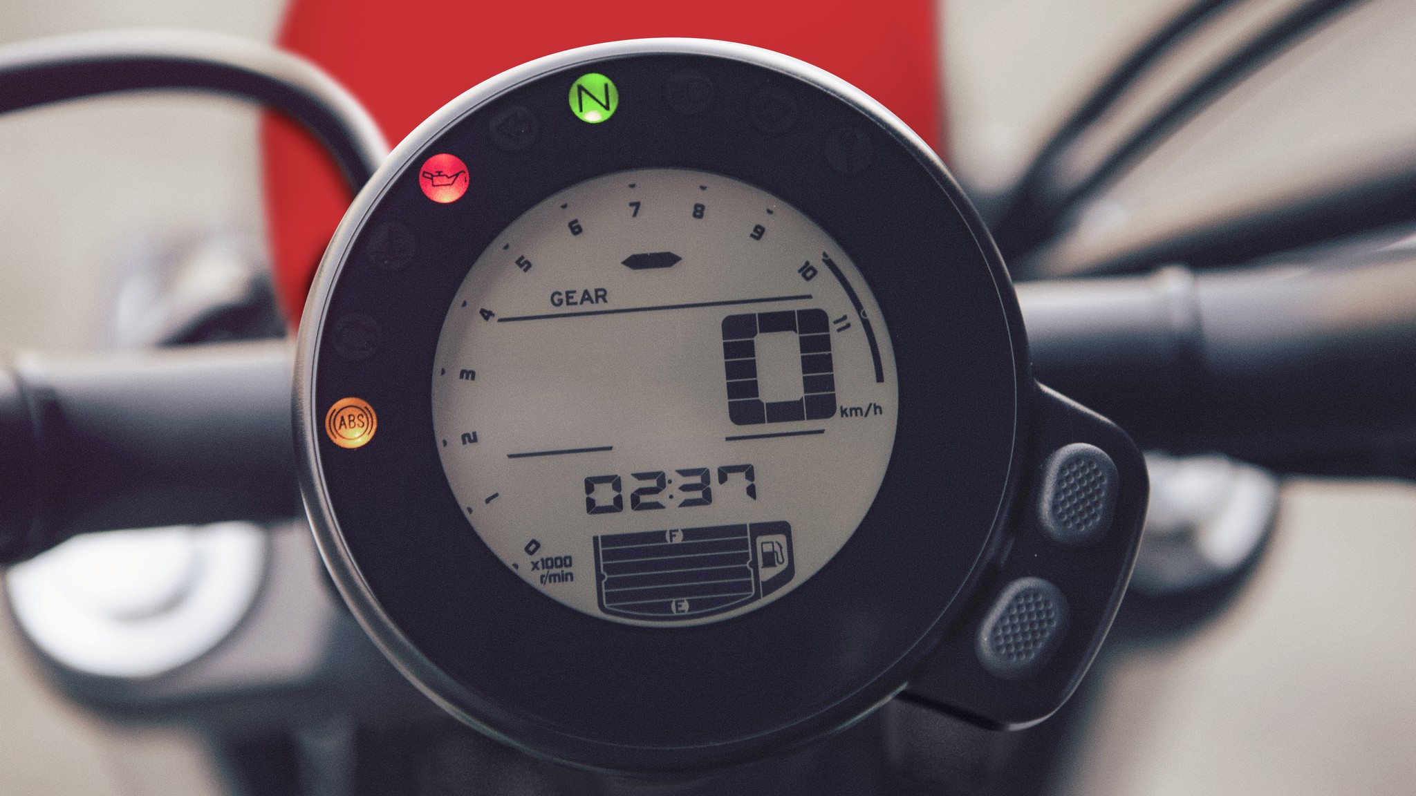 The round LCD panel features a ton of information: digital tachometer, speedometer, gear position, eco mode indicator, ambient and coolant temperature, a fuel gauge and range of trip computer functions including a clock, instant and average fuel consumption, fuel reserve trip meter and the usual trip meters.