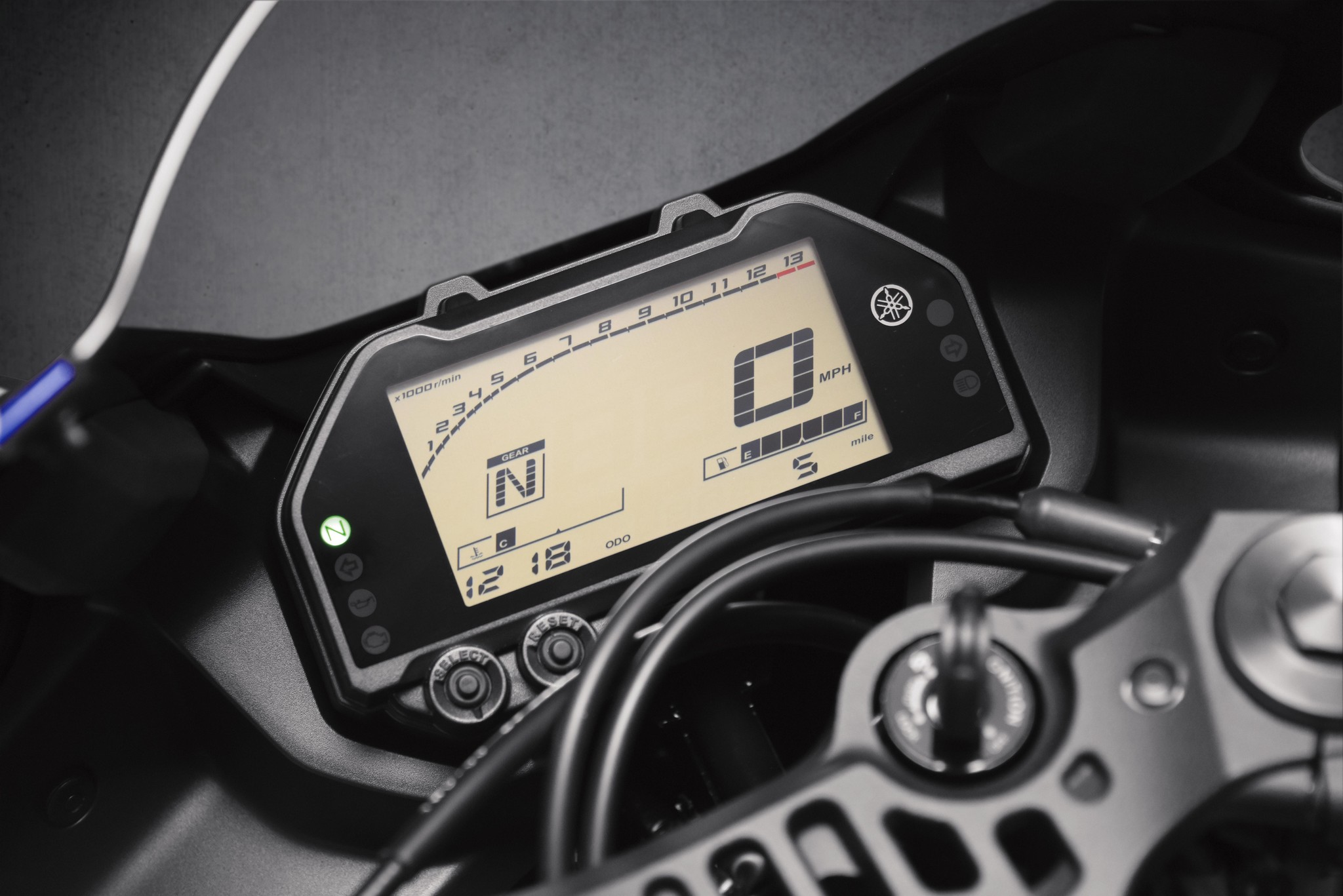 The compact multi-function meter informs the rider of gear position, fuel capacity, real time and average fuel economy, water temp, clock and an oil change trip meter—all presented in a clean, modern layout.