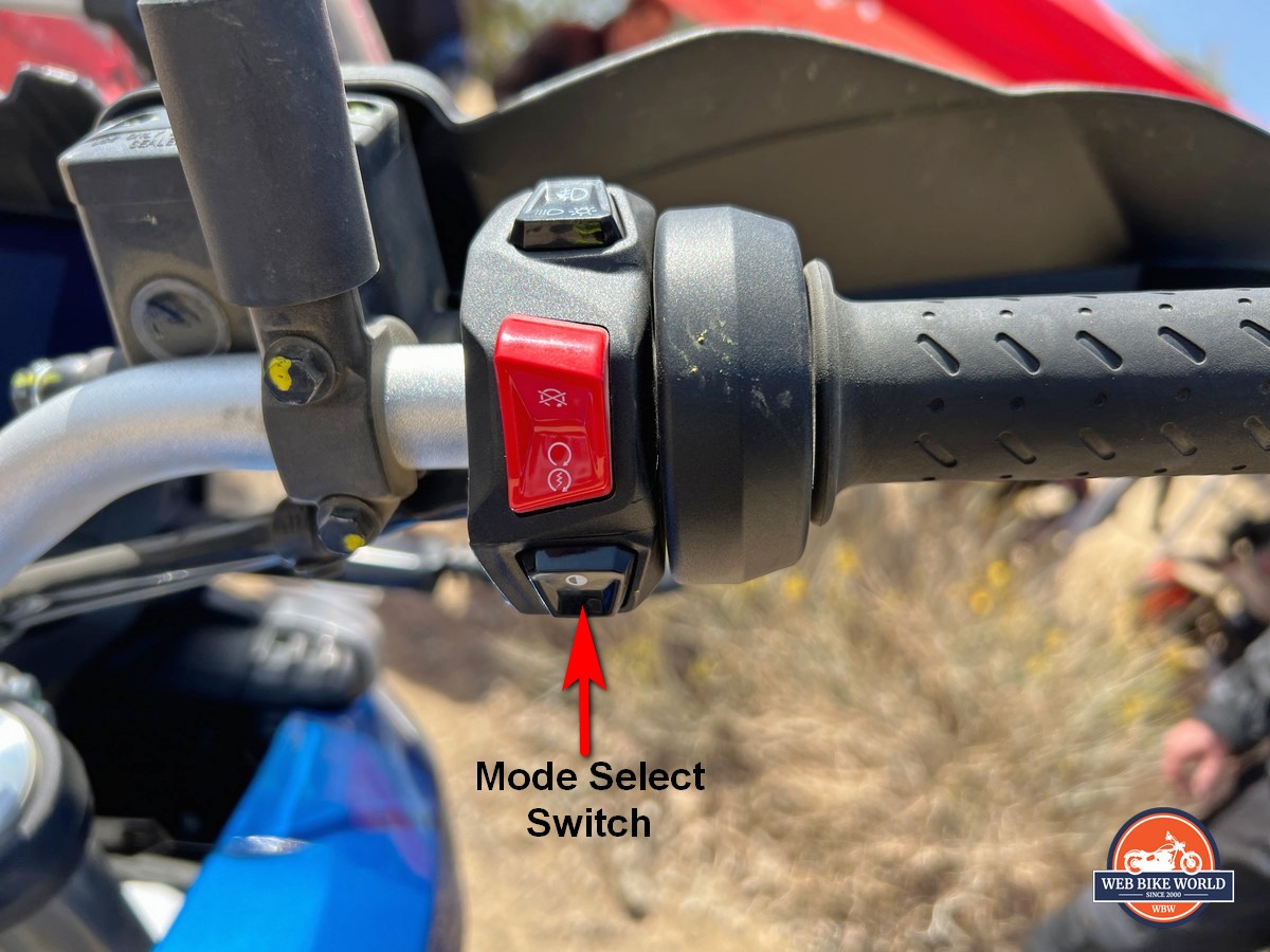 It’s not hard to accidentally switch modes on the Tuareg if you have catcher’s mitt-sized hands. The mode change button is located on the lower section of the right handlebar switch housing near where the rider’s thumb resides.