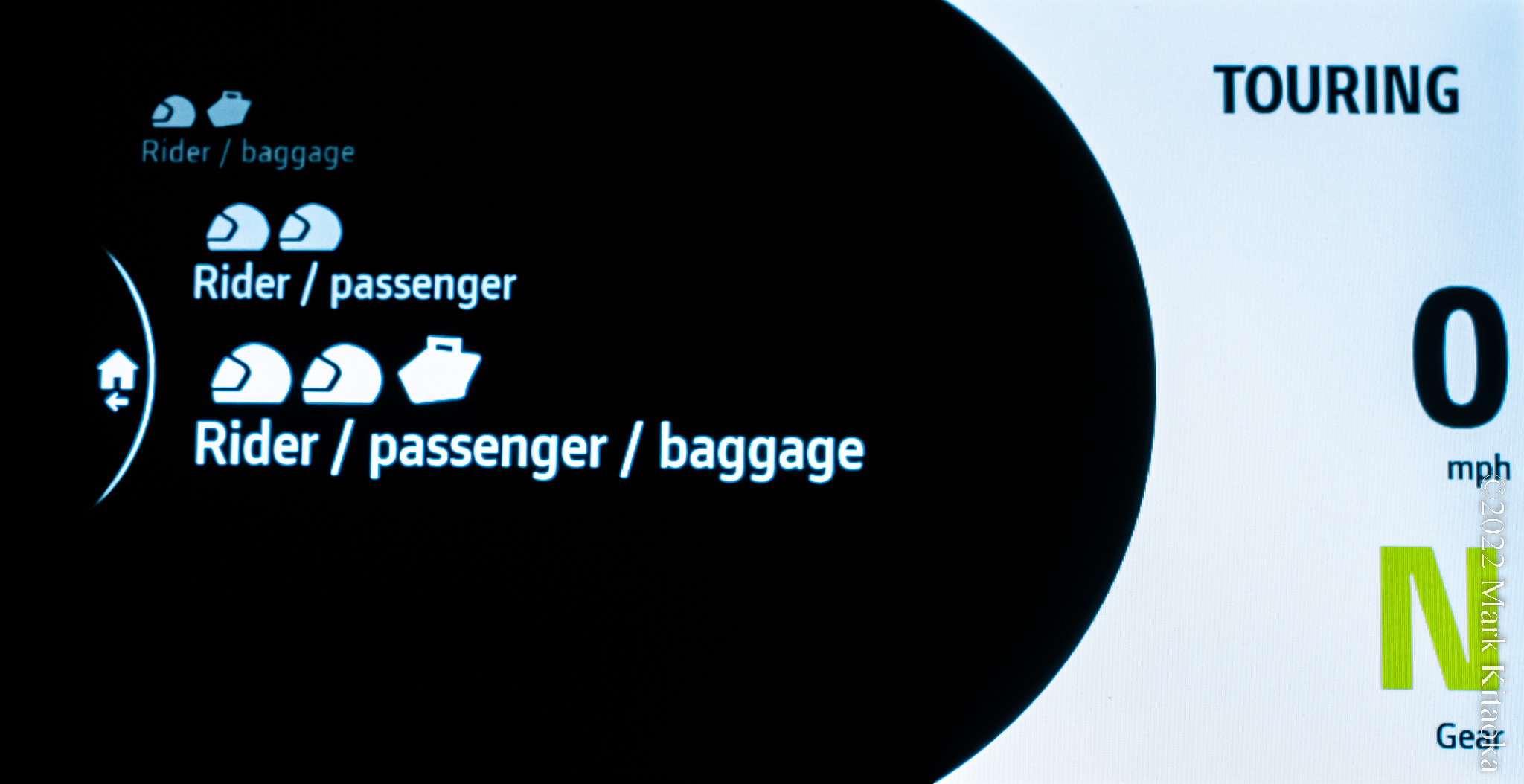 I have talked about the MIN preload feature before but want to reiterate that for someone who shares my inseam length of 30” or less, the MIN feature is welcomed. It really does help quite a bit in controlling the bike in low-speed situations like parking. One tip, deactivate the MIN feature before using the center stand. Makes my life much easier doing so setting the preload to Rider/Luggage/Passenger. Raises the rear shock making using the center stand much easier.