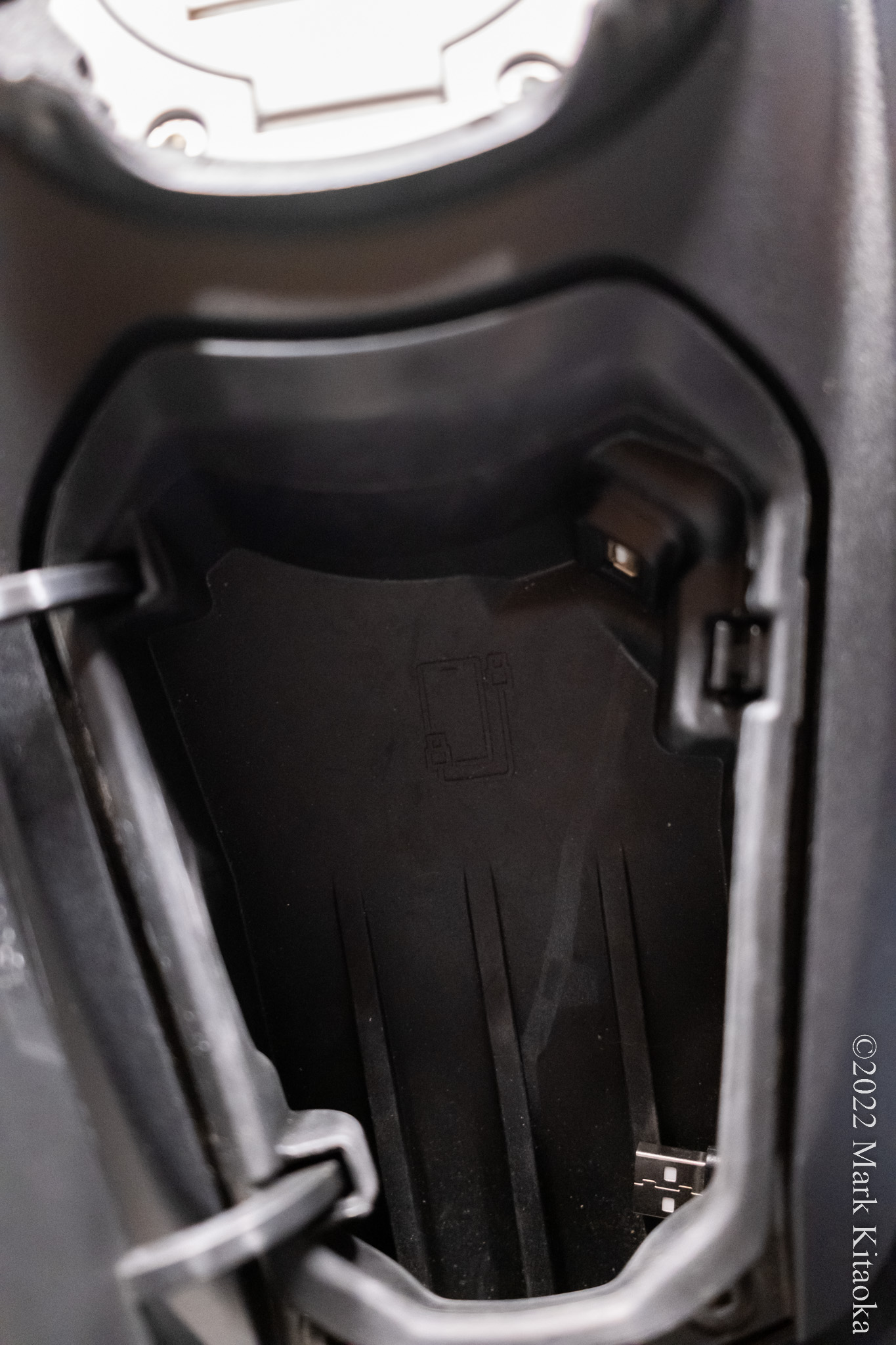 I opted to purchase a Givi small tank bag that attaches to a ring around the fuel filler. Quick on and off which holds just some little items like my gloves and a water bottle. This one allows me to plug a power cord into the MS power socket and then has a three-outlet USB hub inside the tank bag. I use it to charge my camera batteries or portable air compressor.