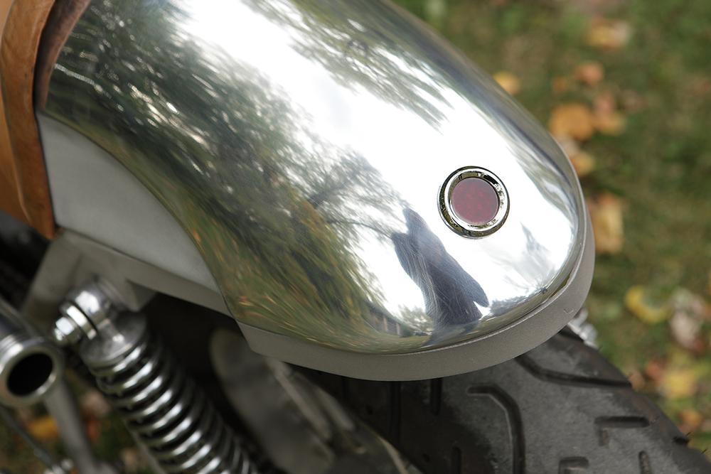 When Craig stripped off the old tank and saw the lines of the frame he decided to make a tank to accentuate those lines. The second most striking piece of custom sheet metal is the front fairing that Craig says he almost gave up on. Well thankfully he didn’t because that is a gem. According to Craig: “With the body work on the Kawasaki I used traditional tools (many of which I made), such as hammers and dollies and, obviously, an English wheel. I usually do a mockup with cardboard outlines before I form the metal. Every piece of aluminum on the KZ started as flat stock. I like to make as many pieces myself as practical, on this bike that includes the rear sets, brackets, exhaust and air cleaners. I designed and constructed the seat to have a simple, clean look and kept the sewing at a minimum (Yes, I can sew as well). The tailpiece houses an EarthX lithium battery and the electronics.