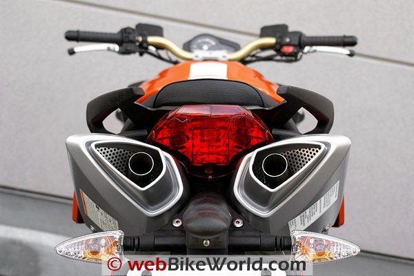 While the styling exercise for the 2-into-1-into-2 under seat exhaust system might get mixed marks, as an engineered piece it is very effective. In essence, the large central housing (catalytic converter, etc) is shaped as part of the rear fender and the two triangular-shaped exhausts branch off along each side.