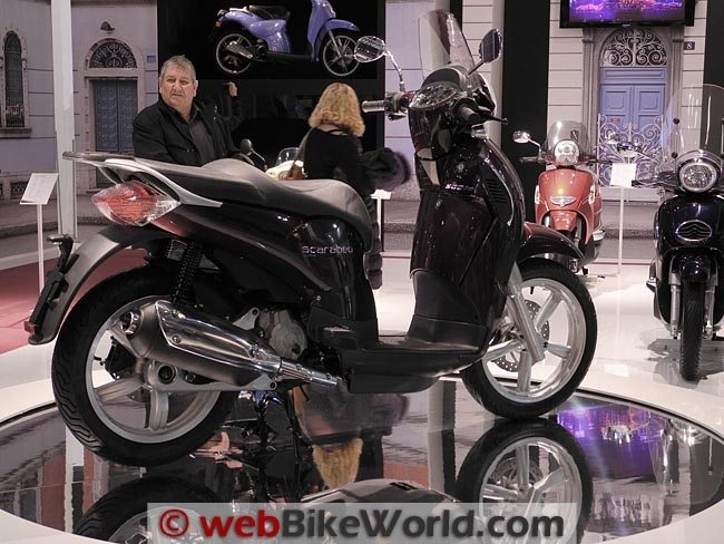 The brands include Piaggio, Vespa, Aprilia, Moto Guzzi, Gilera and Derbi. The SFKATAS (The Scooter Formerly Known As The Aprilia Scarabeo) is now its own brand also, simply called “Scarabeo”. It had a separate display also.
