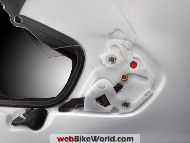 A larger shield latch, derived from Arai�s Formula One helmets, further eases shield operation by providing improved control of the shield�s latching and de-mist functions.