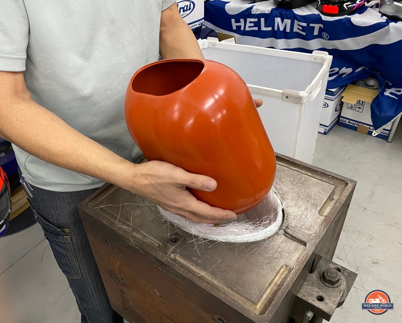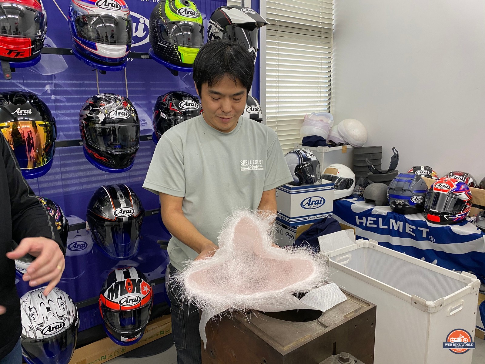 The Arai shell expert in the photo below explained to me the difference between their aeronautical grade carbon fiber weave and other manufacturers’ that cost much less.
