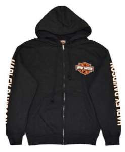 There is a logo of the Wisconsin Harley Davidson dealer on the back of the hoodie, and it has Harley-Davidson written all over its sleeves.