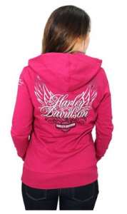 It is a pink colored sweatshirt for women which has a gothic beauty appeal with minimal bar and shield Harley Davidson logo on the left chest and a big emblem of eagle wings with the Harley-Davidson bar and shield logo under it.
