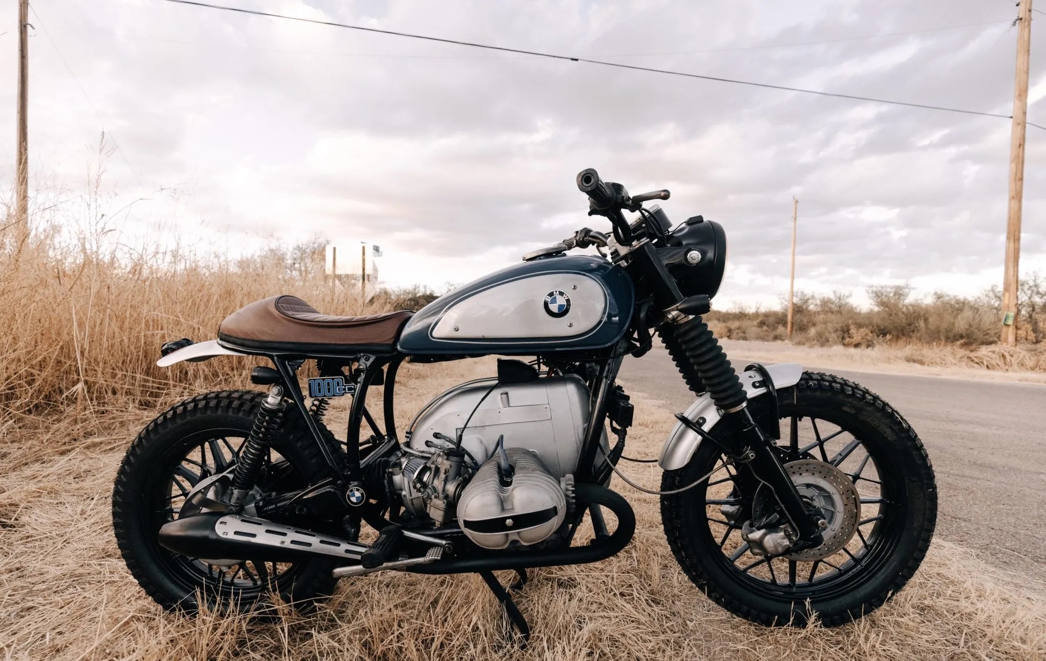 This 1978 BMW R100S was transformed into a scrambler, showcasing various enhancements. The replacement tank has been skillfully repainted in a striking blue hue, adorned with white tank details and iconic BMW roundels. The frame underwent modification, now boasting a sleek black finish, and a bespoke subframe.