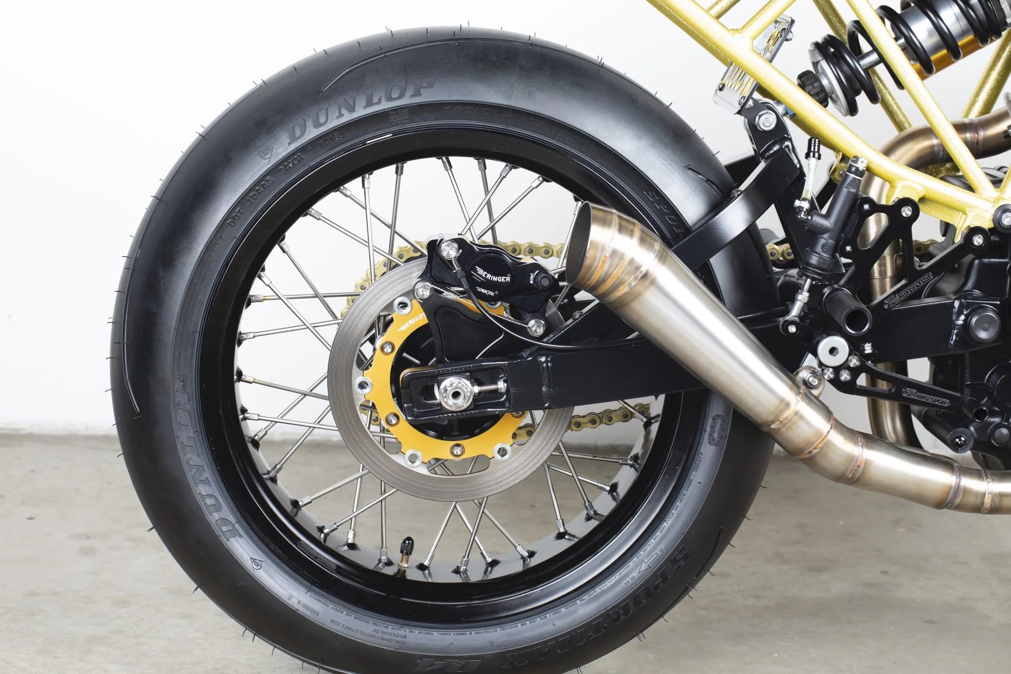 The bike boasts a sleek black finish adorned with tri-color racing stripes, all perched atop a creatively modified gold flake frame. Notable enhancements include the precision of Beringer brakes, the finesse of Öhlins suspension, a meticulously crafted custom aluminum fuel tank and tail section, the convenience of a Motogadget M-Lock and gauge, the agility of LSL clip-ons, and the reliability of Woodcraft rearsets. This Ducati 900SS cafe racer is a true work of art.