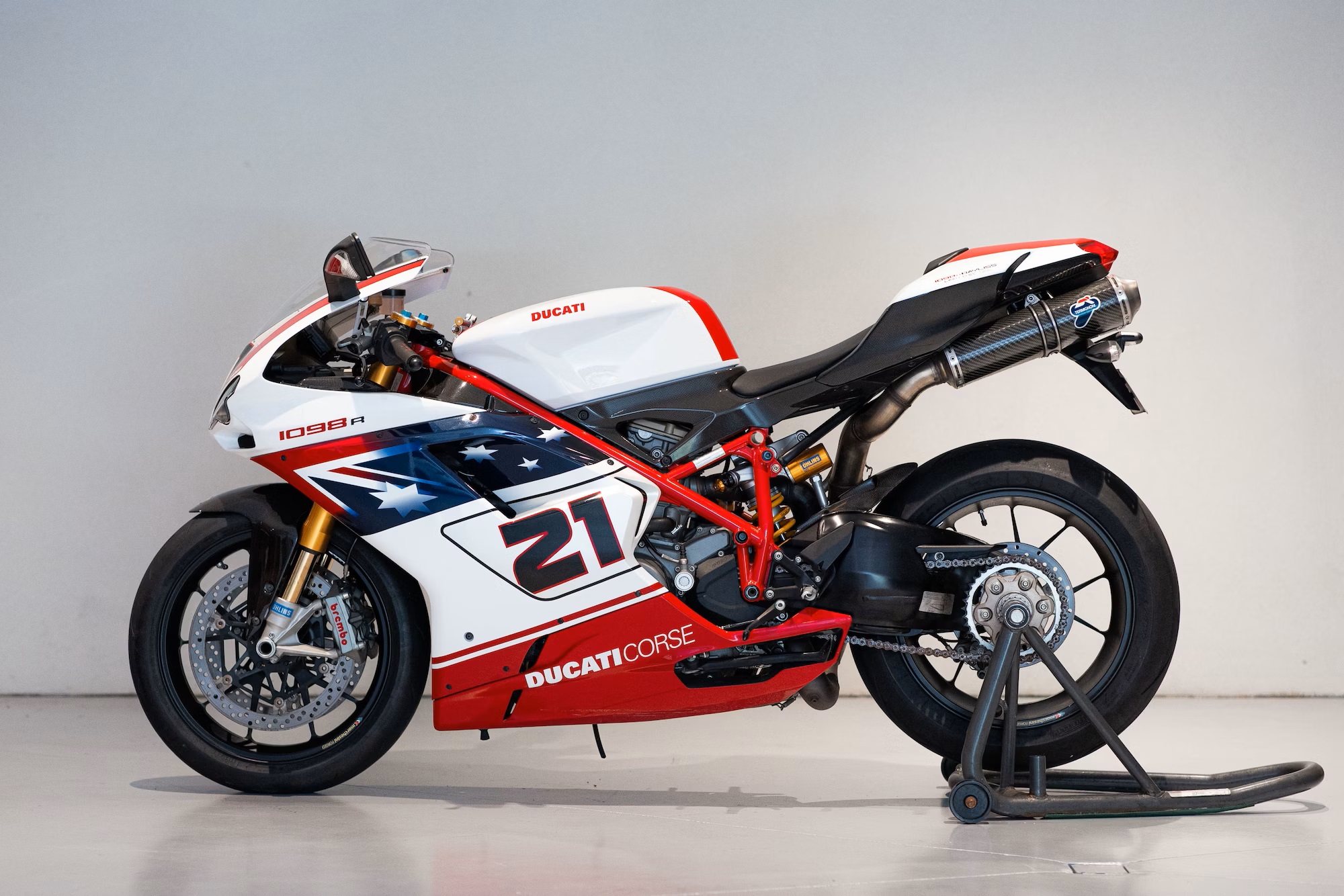 Adorned with the iconic number ’21’ on the pearl white nose and side-fairing number plates, the red and white paint scheme seamlessly integrates the dark blue background of the Australian national flag along the bodywork and into the unpainted carbon fiber stripe along the seat unit.