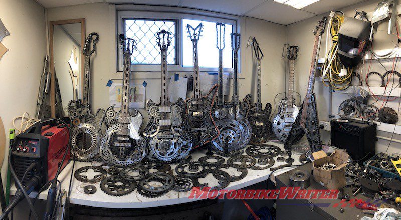 We published an article last year about Brisbane artist and motorcycle racing fan Paul Tinson who makes guitar sculptures from bike parts.