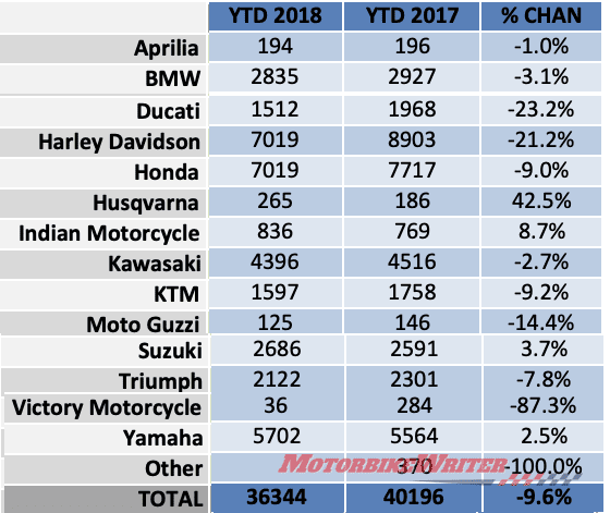 The official 2018 figures from the Federal Chamber of Automotive Industries shows that sales of road and off-road motorcycles, scooters and all-terrain vehicles are down 8.7% to 95,080.
