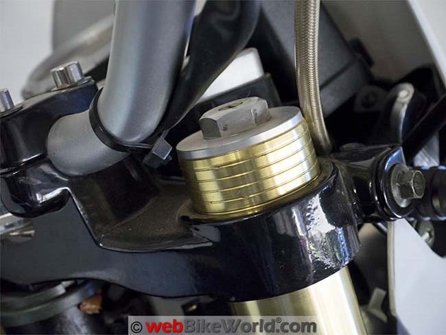 The range available for preload goes a bit too far on this bike in that the last inch or so of least preload is enough to have the spring dangling if the swingarm reaches its limit of travel.