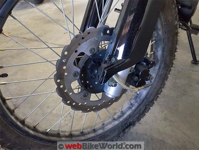 The brake line routing on the front caliper sticks out to the side in a weird way, considering the off-road aspirations of the bike’s design.